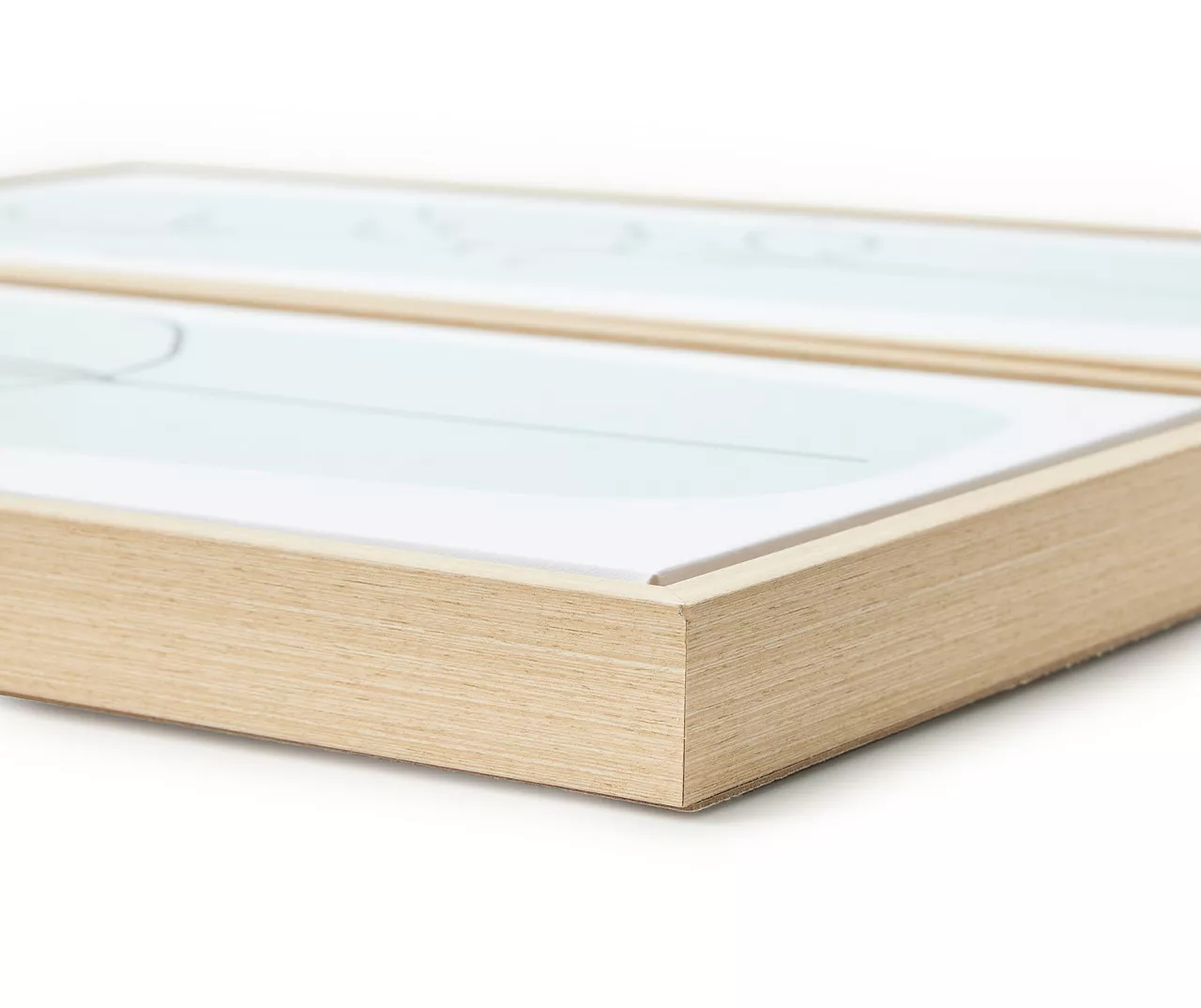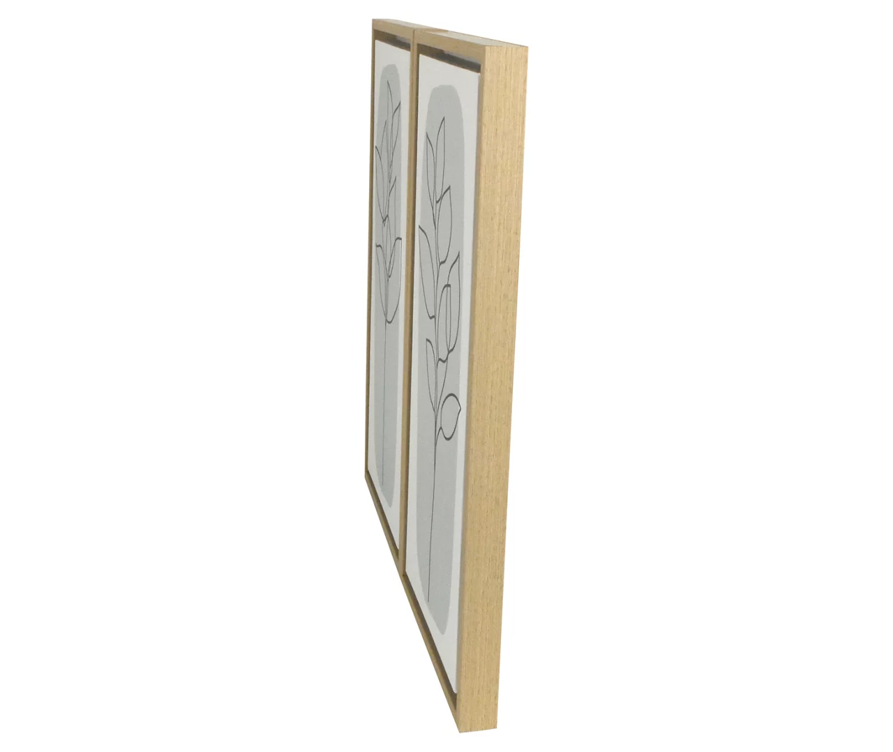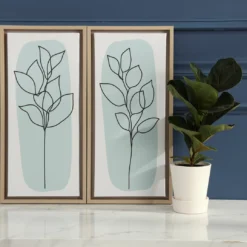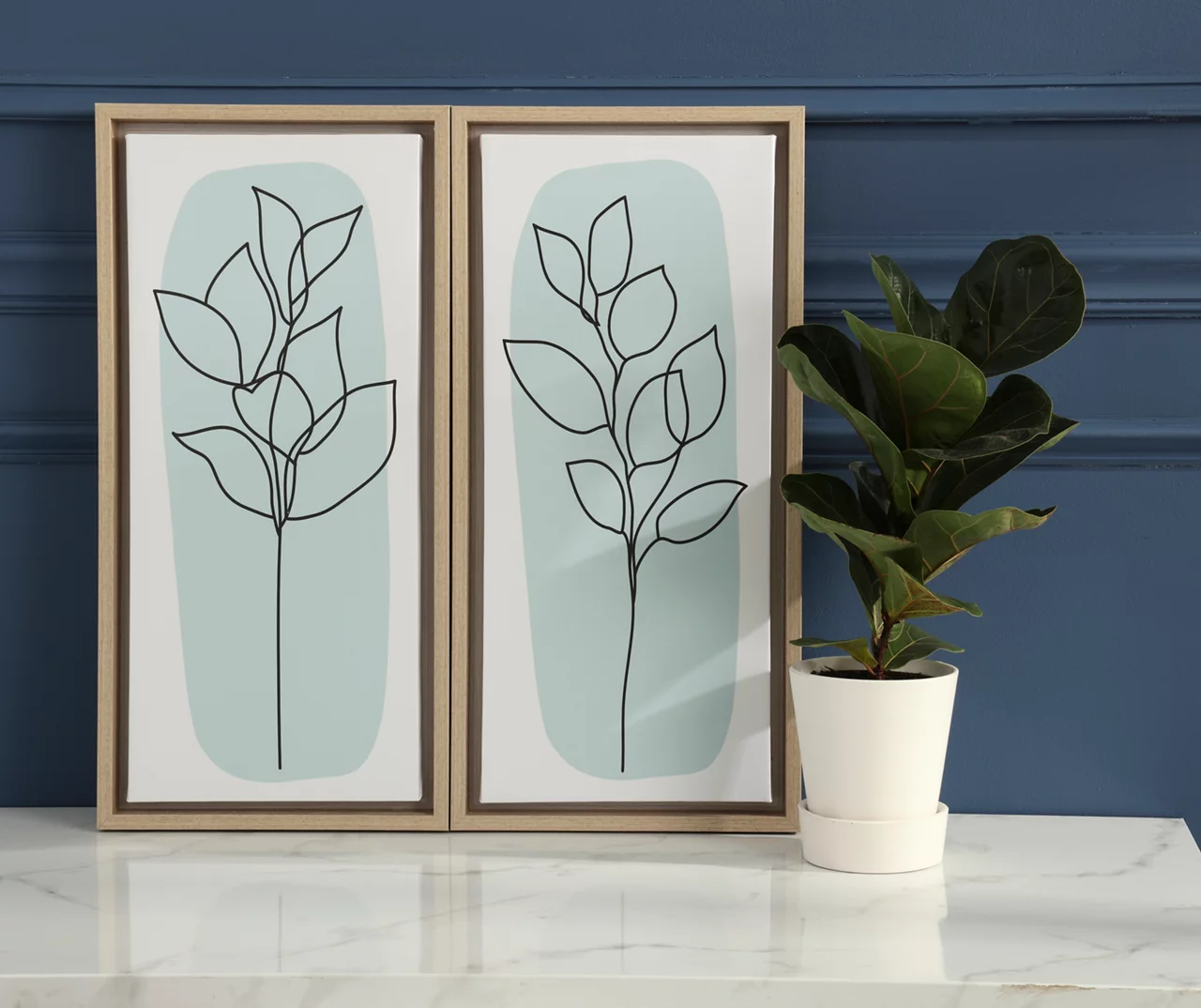 Create a modern botanical display in your home with this 2-pack canvas set featuring a pair of linework leaf designs in black against a soft blue background with white borders. A light brown frame completes the look with minimalist polish.