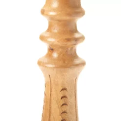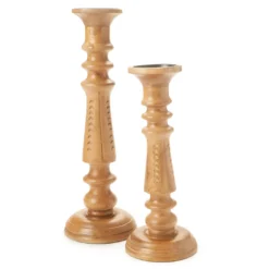 Blending classic spindle style with notched detailing on the sides, this mango wood candle holder elevates and displays your favorite candles with eclectic modern charm.