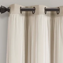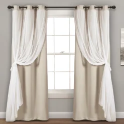 These curtains give you multiple looks in one set thanks to a tan blackout lining and sheer white overlay. The insulated blackout panel helps to block light and filter outside noise, while the sheer overlay allows lots of natural light to enter your space while still providing privacy. Choose to leave both panels hanging, or tie one back for an elegantly layered look. No matter how you style them, these panels are the perfect finishing touch in a living room, dining room, bedroom or office.