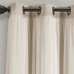 These curtains give you multiple looks in one set thanks to a tan blackout lining and sheer white overlay. The insulated blackout panel helps to block light and filter outside noise, while the sheer overlay allows lots of natural light to enter your space while still providing privacy. Choose to leave both panels hanging, or tie one back for an elegantly layered look. No matter how you style them, these panels are the perfect finishing touch in a living room, dining room, bedroom or office.