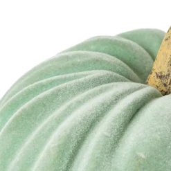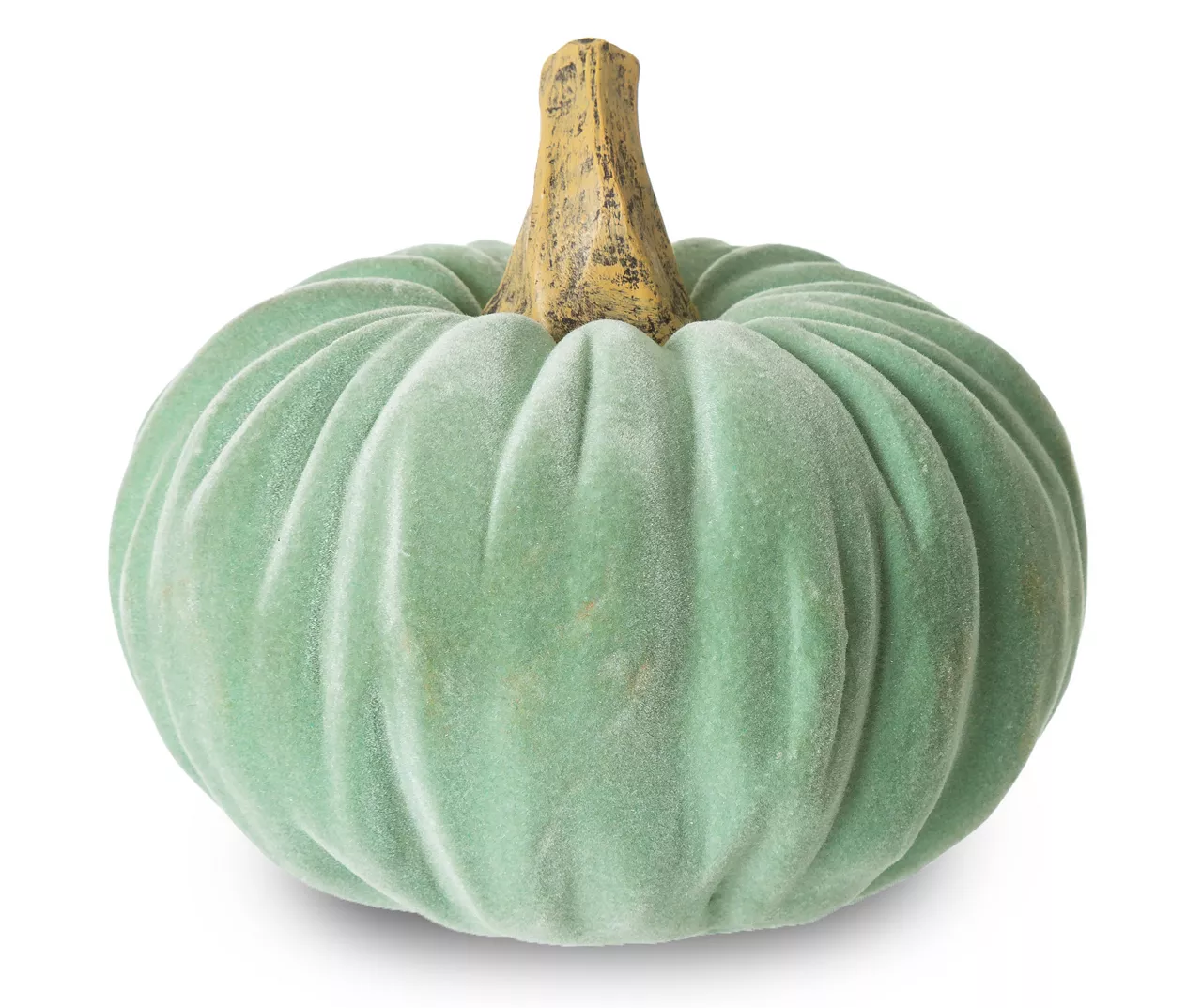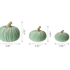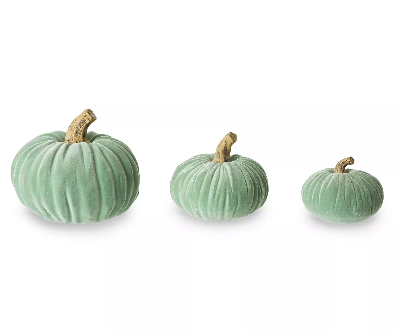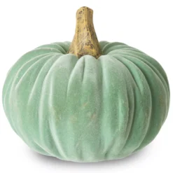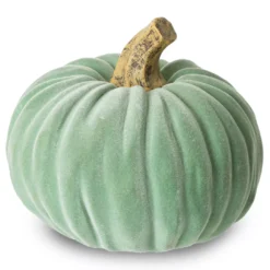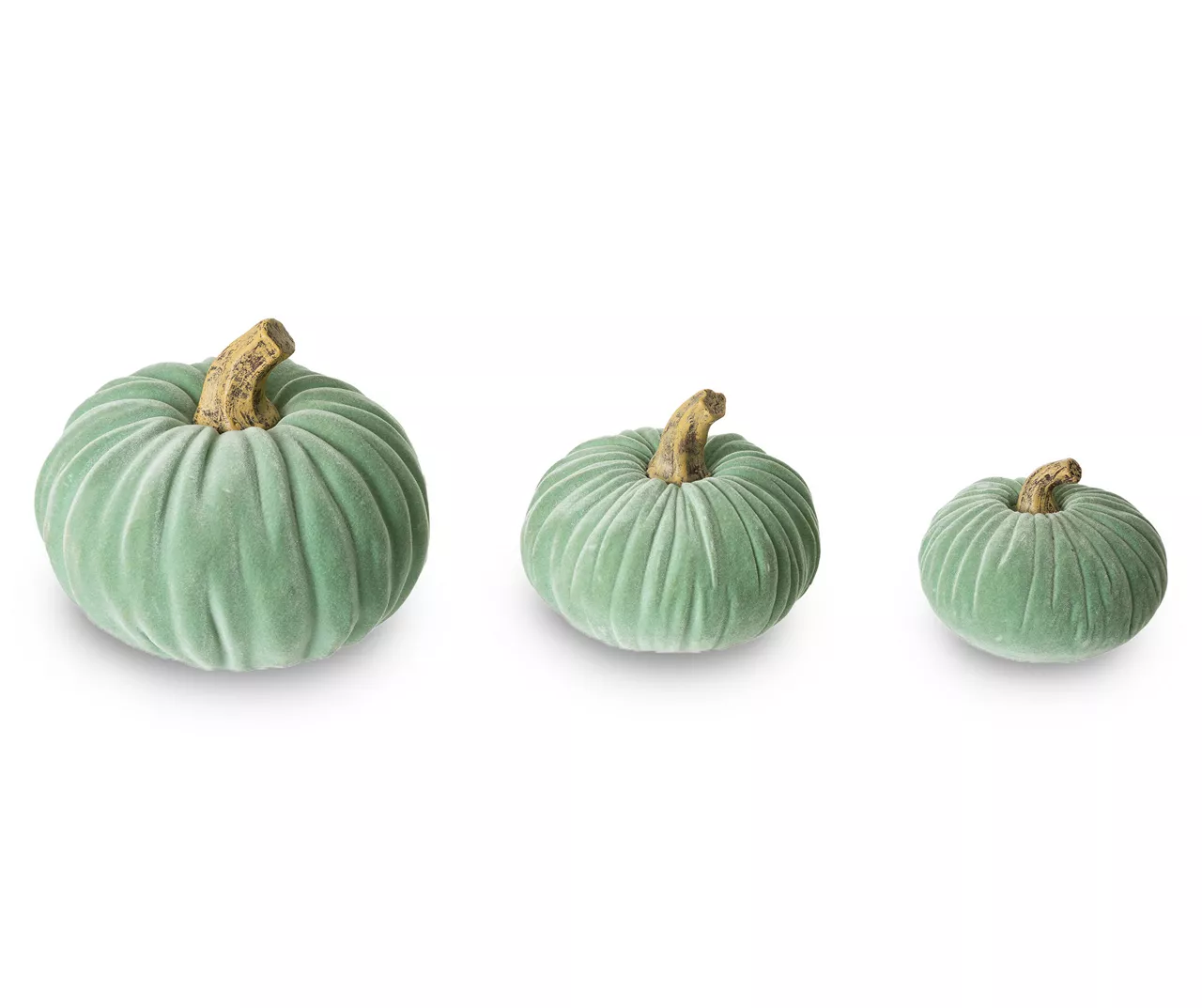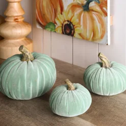 This set of three pumpkins are great to put just about anywhere that is in need of some seasonal influence. All are artfully made with mint green velvet covered resin, making them a beautiful piece of décor for any space. These pumpkins can be set together or placed separately to add a little autumn fun to several different rooms in your home.