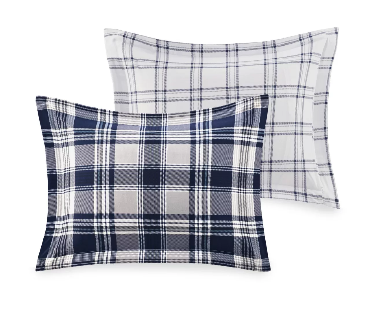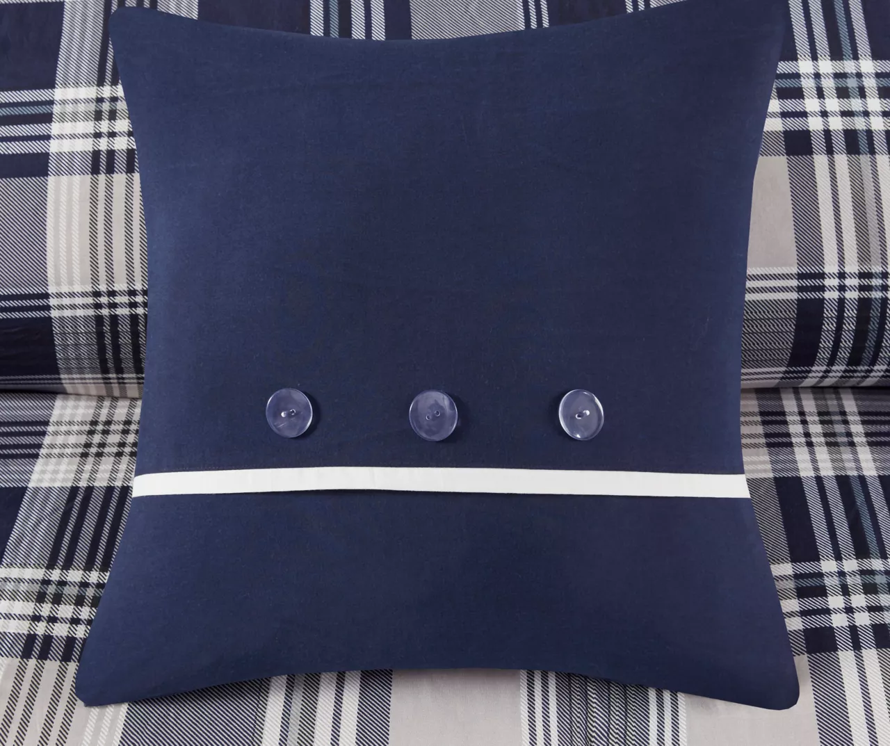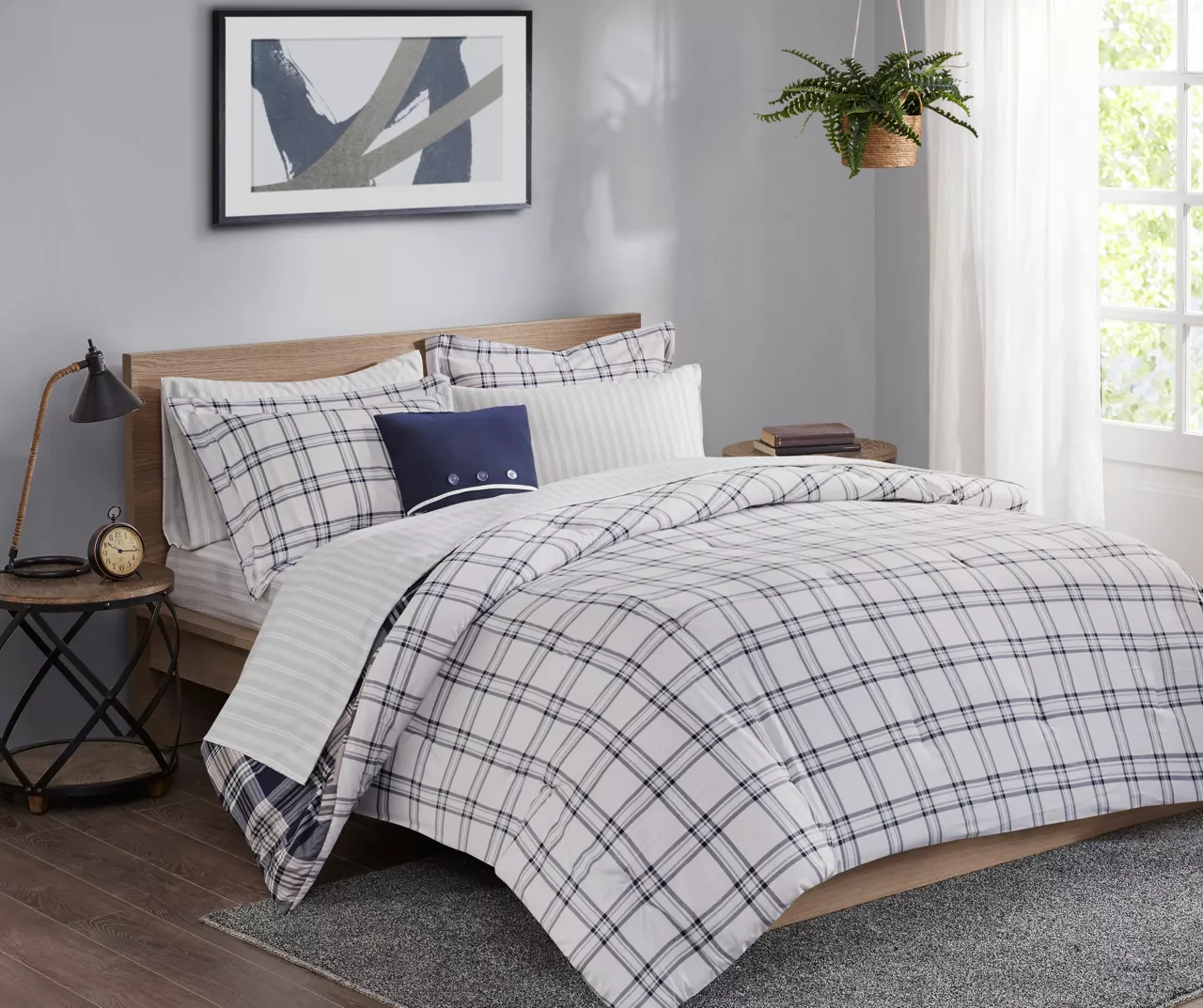 Restyle your bedroom with the Leroy Reversible Complete Bedding Set. The reversible comforter and shams feature a plaid print on the face and a white plaid print on the reverse, for a charming casual look. A coordinating square decorative pillow adds a finishing touch to the comforter. Also included is a sheet set, complete with a flat sheet, fitted sheet, and 2 pillowcases. Bringing the best in health and wellness, this bedding set also features an anti-microbial treatment that provides built-in freshness protection, reducing the growth of odor causing bacteria and keeps fabric lasting longer. This bedding set is also OEKO-TEX certified, meaning it does not contain any harmful substances or chemicals, ensuring quality comfort and wellness.