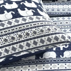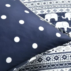 Beautify the bedroom with boho vibes when you add this plush and cozy bedding set from Lush Decor featuring an eclectic mix of prints and patterns arranged in a color block design in deep navy and bright white. A matching decorative pillow flaunts an elephant applique on a polka dot background for a dash of safari style, and the round accent pillow delivers soft texture thanks to its lush faux fur construction.