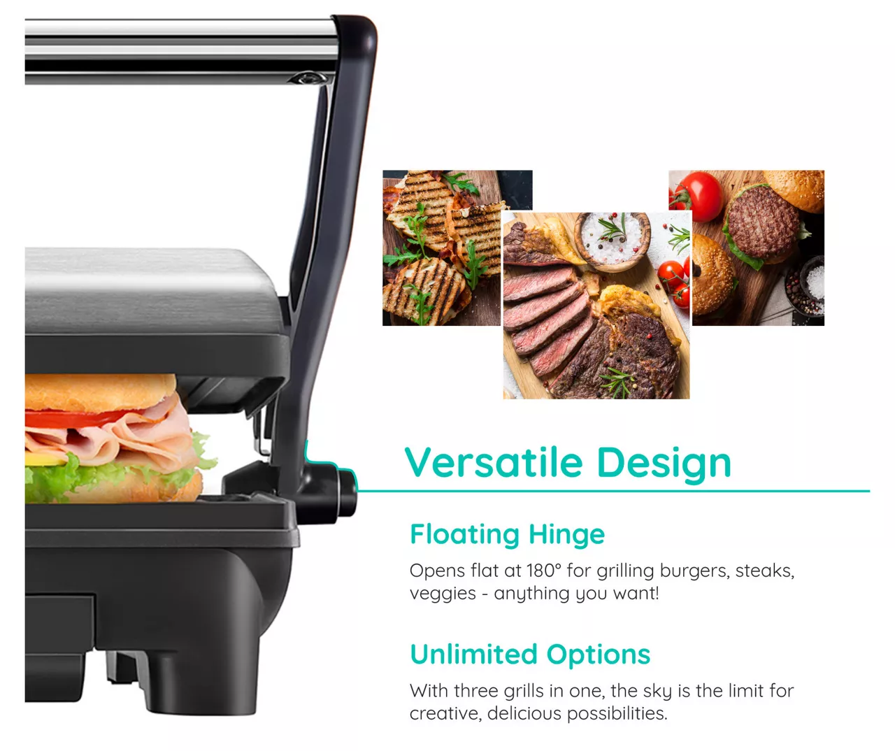 With the New House Kitchen Panini press grill and gourmet sandwich maker, you can make perfectly pressed panini’s right at home. Designed like professional units, this sandwich press has an adjustable floating hinge to accommodate any thickness for perfectly grilled thin or thick panini’s and sandwiches. With just the push of a button, the grill opens to a full 180 degrees, perfect for grilling meats, vegetables, fish and more. This panini and grill combo is perfect for making breakfast, lunch, dinner and more!