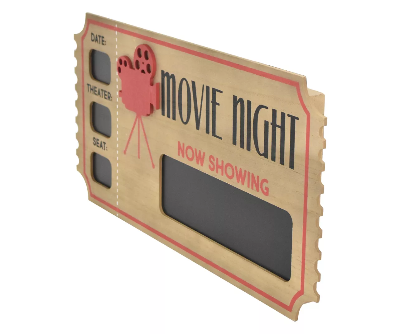 Share what’s playing where at your home theater with this charming chalkboard shaped into a classic ticket stub. A “Now Playing” section is complemented by fields for date, theater and seat so everyone knows where to go.