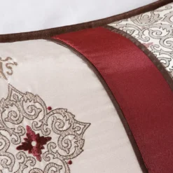 Perry is an elegant update to your bedroom through its red comforter that features a modern color block look with embroidered taupe details. Bold red stripes draw your eye and three decorative pillows further accentuate the colors and embroidered details in this collection. Two king shams and a complementary bed skirt pull the whole look together.