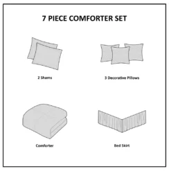 - Includes comforter, bed skirt, 2 – shams and 3 – decorative pillows