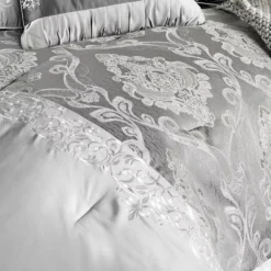 - Comforter features a rich damask and medallion jacquard with embroidered borders