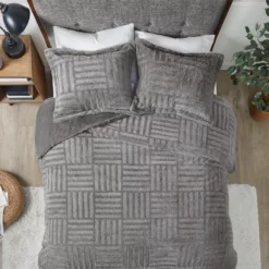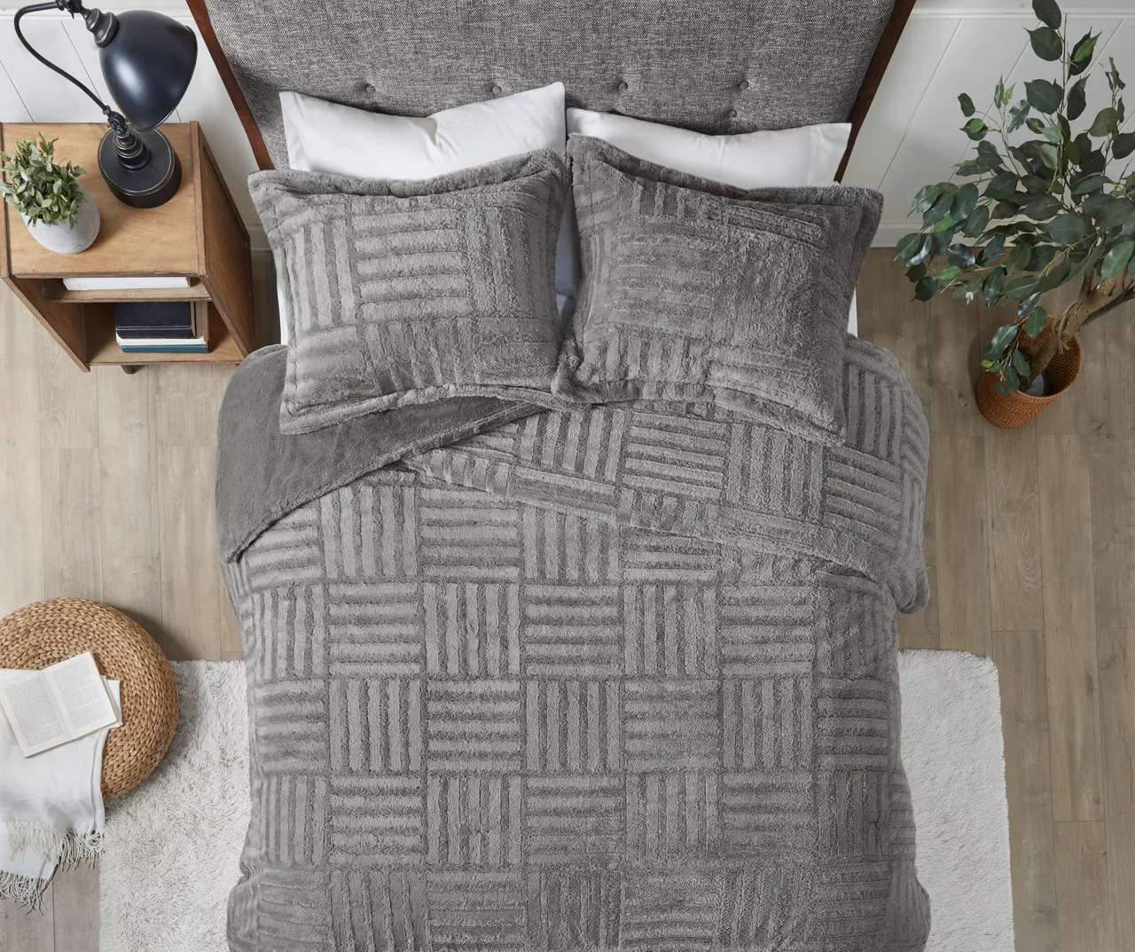 Add warmth and comfort to your bed with this Polar faux fur down-alternative comforter. The faux fur is incredibly soft and smooth and features a patchwork stripe design in a solid gray shade for added texture and dimension. The set is machine washable for easy care and brings chic modern style to a guest or master bedroom.