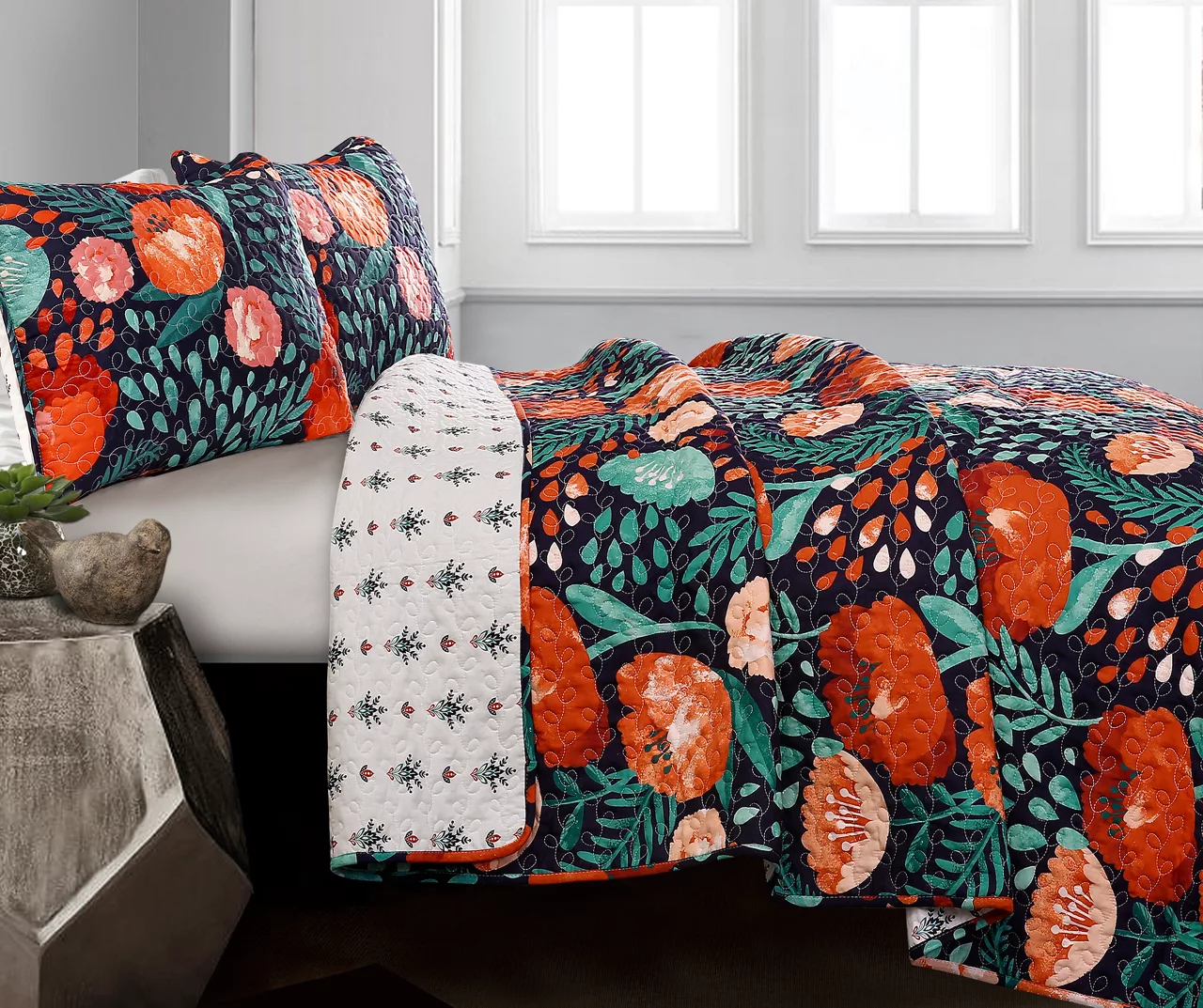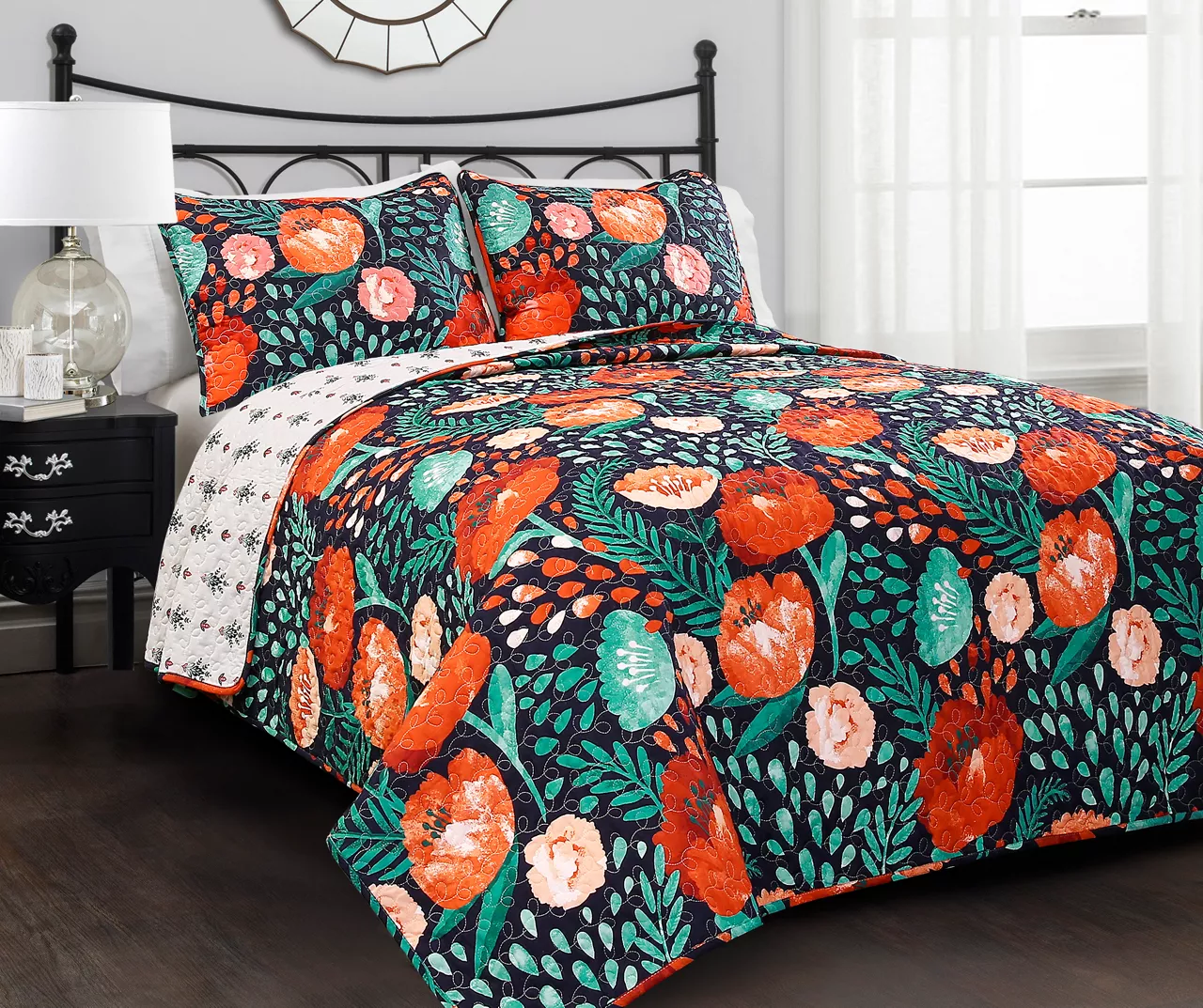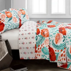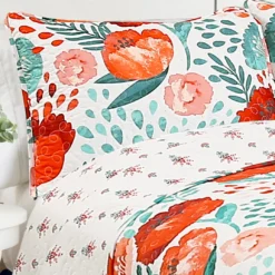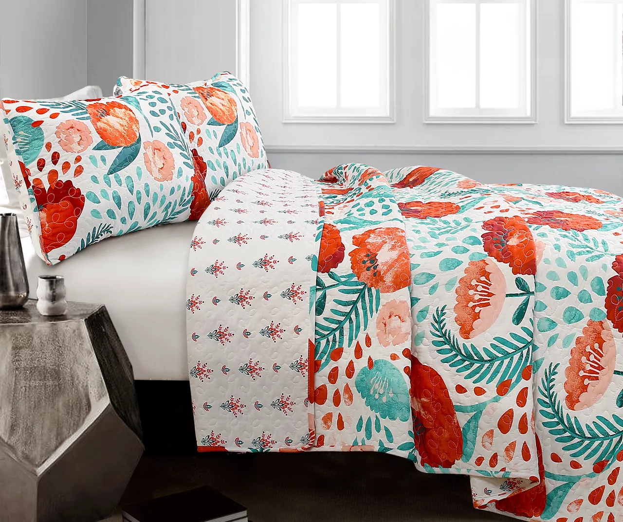 A watercolor poppy print brings a splash of natural sophistication to your sleep space, complemented by a neat floral pattern on the reverse side of this quilt set. Breathable cotton fabric keeps you comfy and cozy through the night, and coordinating shams complete the look.