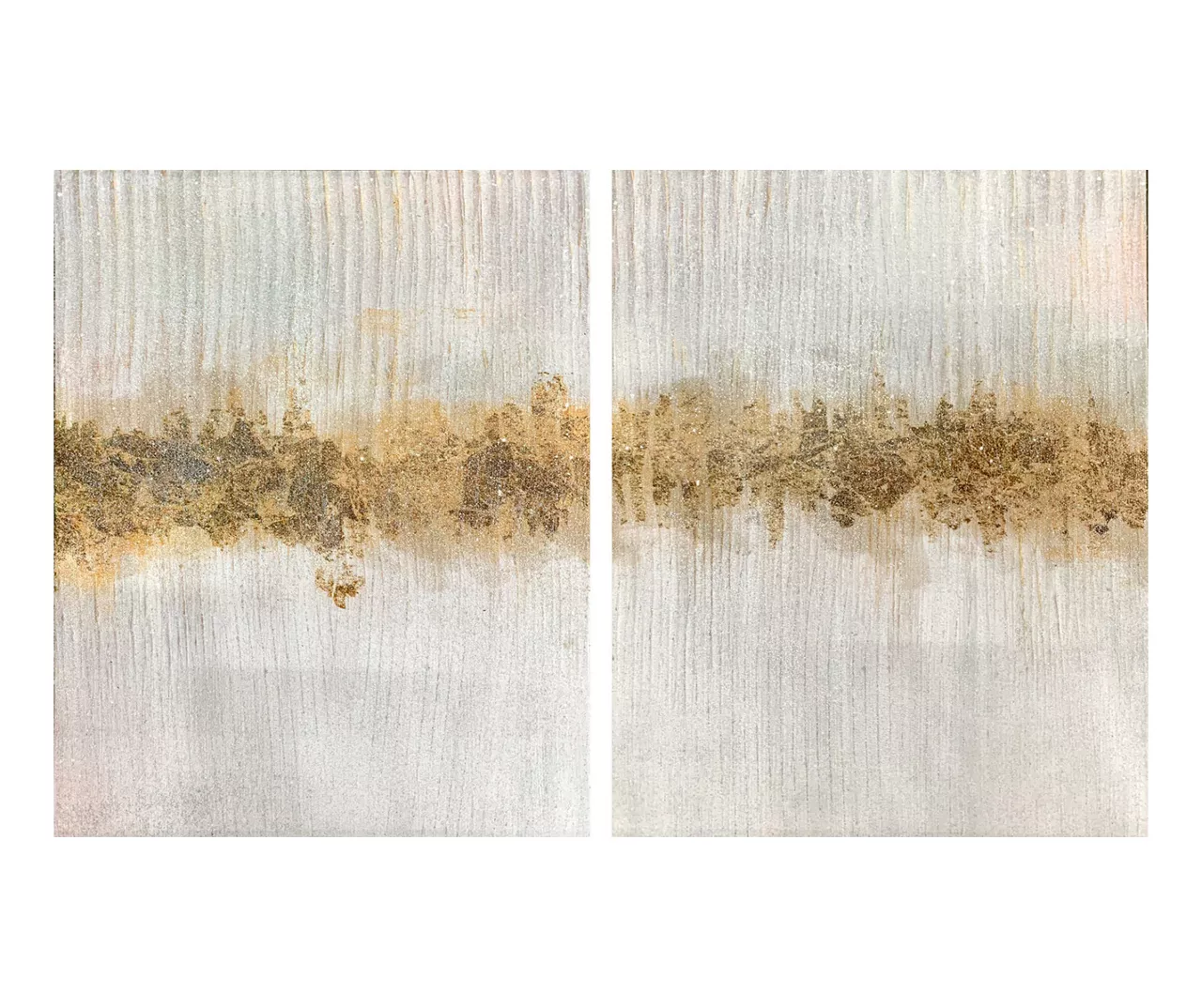 Curate a look for your home with this art canvas set. Each vertical canvas is created with an abstract rake effect and textured glitter. This set is a stunning artistic addition to a living space, entryway or kitchen.