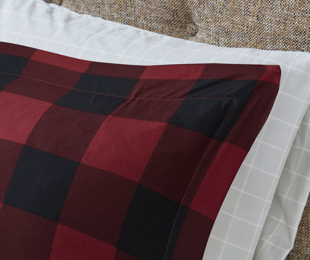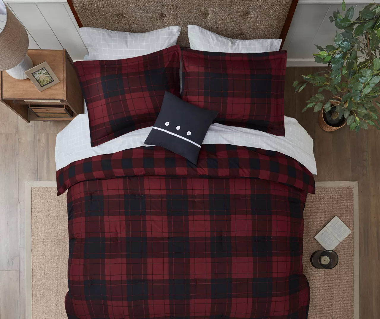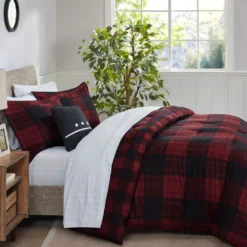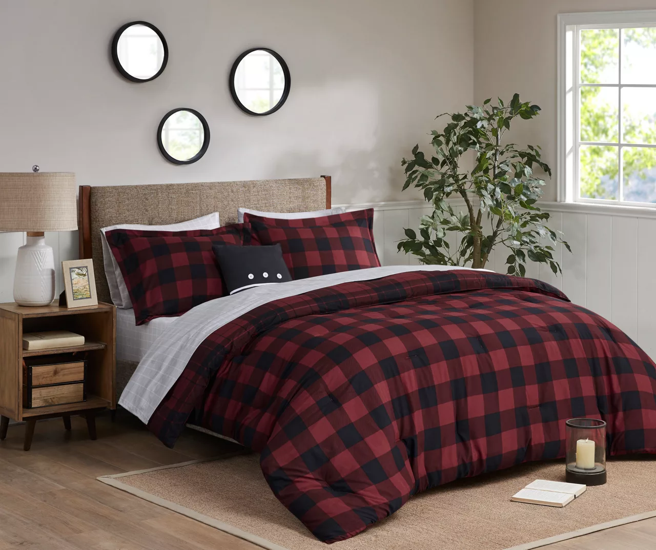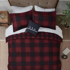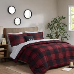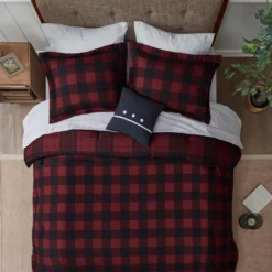 The Rochester 6-Piece Reversible Complete Bedding Set brings a cozy cabin allure to your bedroom decor. A red and black buffalo check print adorns the front of the ultra-soft microfiber comforter, for a rustic lodge look. On the reverse, a smaller checker pattern in a coordinating color scheme complements the top of the bed, while a matching sham completes the reversible comforter set. A square decorative pillow with embroidery and button details and a solid black bed skirt add the finishing touches. This complete bedding set is OEKO-TEX certified, meaning it has no harmful substances or chemicals ensuring quality comfort and wellness. Bringing the best in health and wellness, this bedding set also features an anti-microbial treatment that provides built-in freshness protection, reducing the growth of odor causing bacteria and keeps fabric lasting longer.