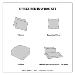 - Includes comforter, 2 shams, 1 decorative pillow, 1 flat sheet, 1 fitted sheet and 2 pillowcases