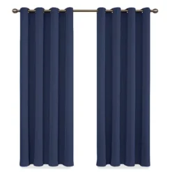 Find the perfect combination of fashion and function with the navy Round and Round blackout window panel from Eclipse. This functional curtain helps provide privacy, manage light, reduce noise and help with energy savings, without sacrificing the latest looks in window fashion. It offers blackout benefits and features a subtle geometric pattern of interlocking circles in blue. Blackout yarns are intricately woven into the panel, giving it a rich handfeel and luxurious drapability.