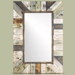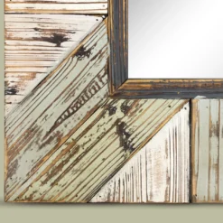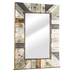 This wall mirror features a frame of distressed wood in antiqued shades of white, blue and brown. Small planks of weathered wood with a visible grain are arranged in a striped pattern. This functional and decorative mirror is especially suited to spaces with modern farmhouse design, country style or vintage decor. Hang it above a bedroom dresser, behind dining room furniture or in any other location you would like to enlarge and enhance with a clear reflection framed in rustic wood.