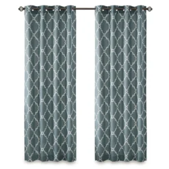 For a casual and stylish update, the Sereno fret window curtain is the perfect addition to any decor. This window panel features a trendy fretwork in a unique and fresh color duo, creating a simple yet modern look. The cotton blend basket weave fabric softly filters the perfect amount of sunlight into your home, while providing texture for natural appeal. Silver grommet top detail makes this panel easy to hang, open and close throughout the day.