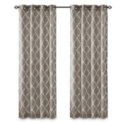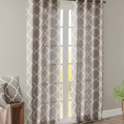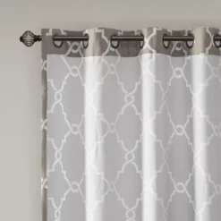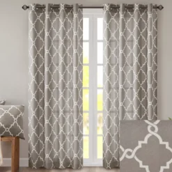 For a casual and stylish update, the Sereno fret window curtain is the perfect addition to any decor. This window panel features a trendy fretwork in a unique and fresh color duo, creating a simple yet modern look. The cotton blend basket weave fabric softly filters the perfect amount of sunlight into your home, while providing texture for natural appeal. Silver grommet top detail makes this panel easy to hang, open and close throughout the day.