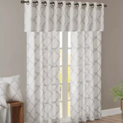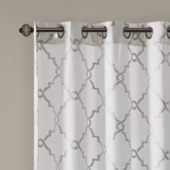 For a casual and stylish update, the Sereno fret window curtain is the perfect addition to any decor. This window panel features a trendy fretwork in a unique and fresh color duo, creating a simple yet modern look. The cotton blend basket weave fabric softly filters the perfect amount of sunlight into your home, while providing texture for natural appeal. Silver grommet top detail makes this panel easy to hang, open and close throughout the day.