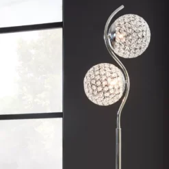 Update your home with the modern vibes of this unique floor lamp designed with two domed shades fitted with a metal lattice and faceted acrylic embellishments that cast sparkling illumination in all directions. A dimmer switch lets you control the lighting to suit your needs.