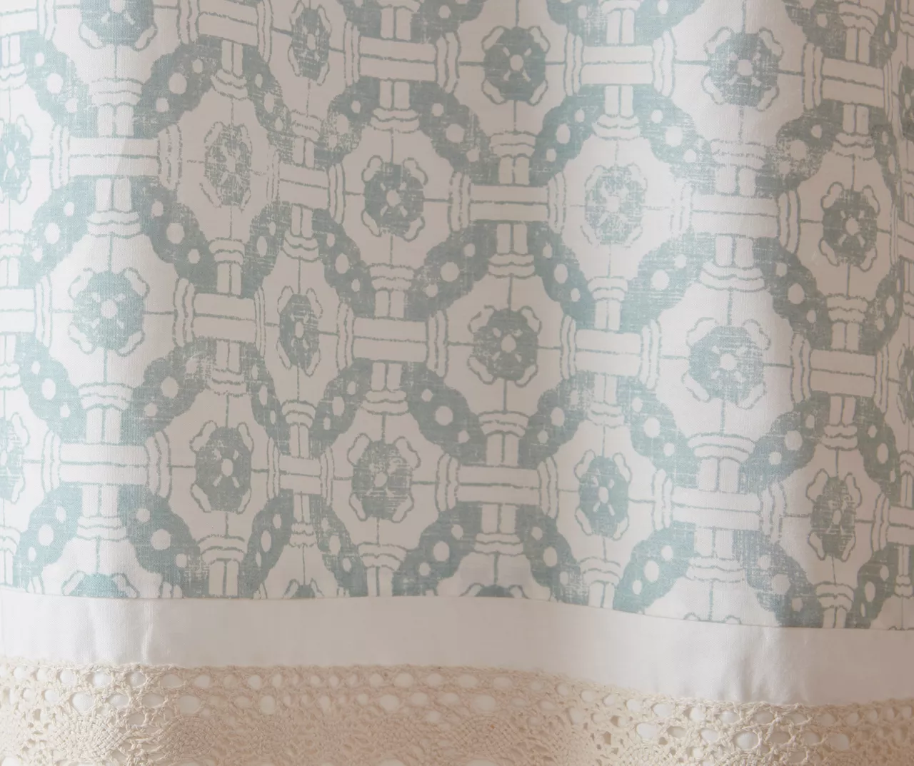 Shabby chic in all the right ways, the Stella printed and pieced valance is the perfect update for any room. The paisley print and delicate pieced design showcases a soft color palette of blue, periwinkle and white hues, finished with a lace trim for additional charm and texture. Made from 100% cotton for natural appeal, this valance features a rod pocket. Complete the look with coordinating kitchen tiers or perfect on its own for small windows or layering.