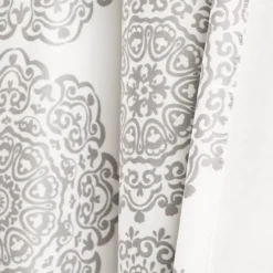 - Gray medallion stripes elevate a solid white curtain
