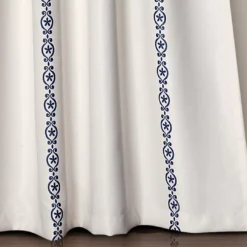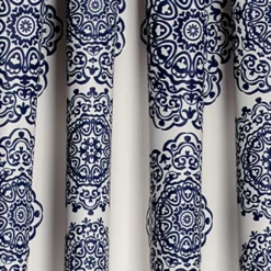 - Navy medallion stripes elevate a solid white curtain