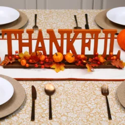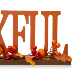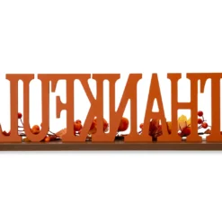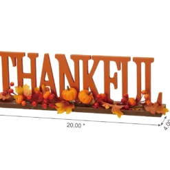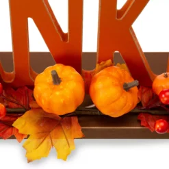 Add color and whimsy to any tabletop with this orange wooden word décor. Made in the shape of its festive “thankful” message, eye-catching orange color and charming design featuring pumpkins, berries and leaves, this is a charming centerpiece that suits any aesthetic.