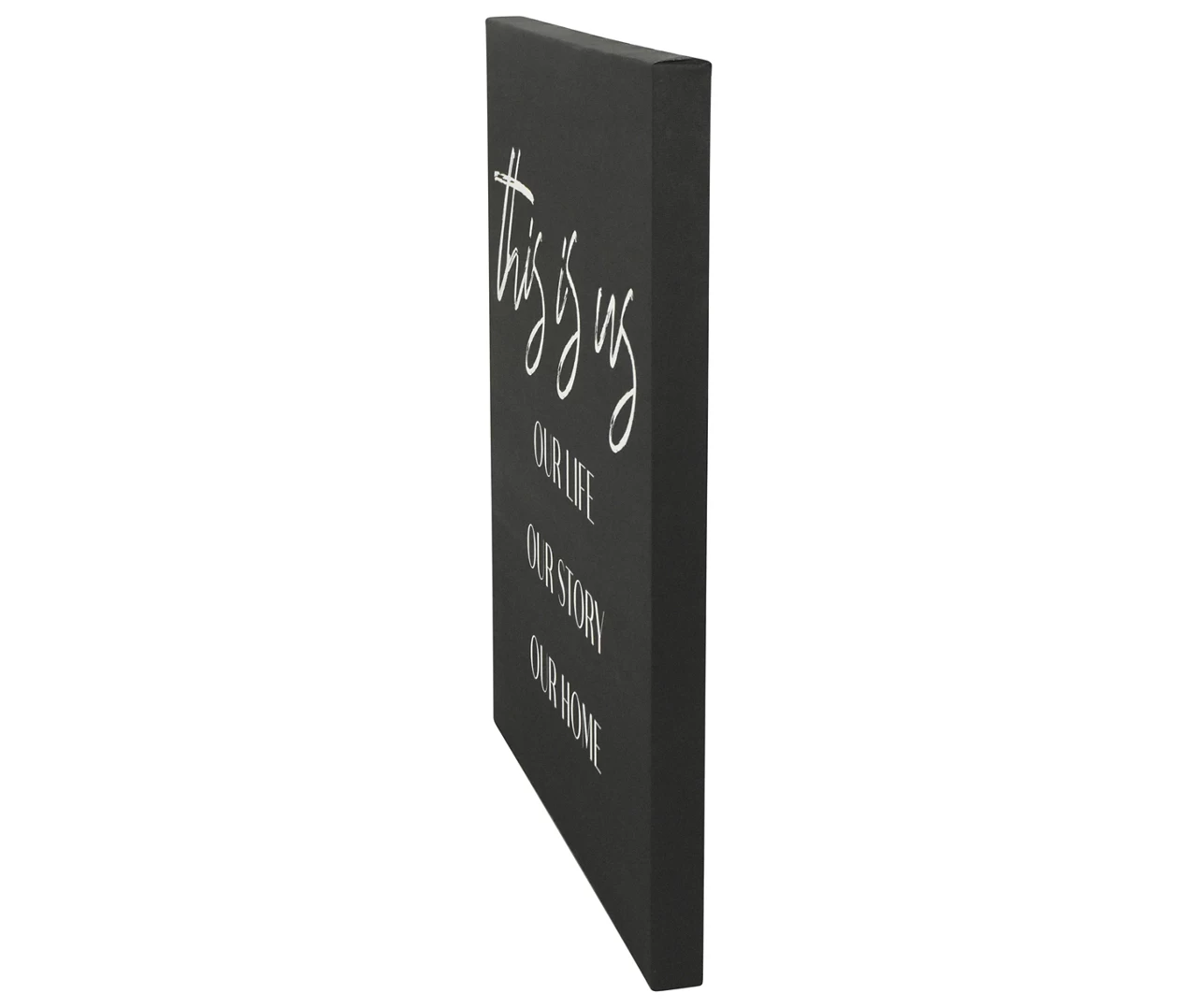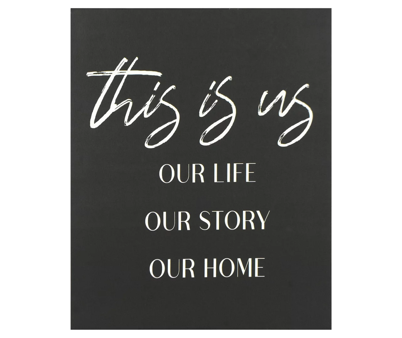 Sprinkle a little heartfelt warmth in your decorative arrangements with this typographic wrapped canvas featuring a “this is us” message in bold black and white hues for a modern look.