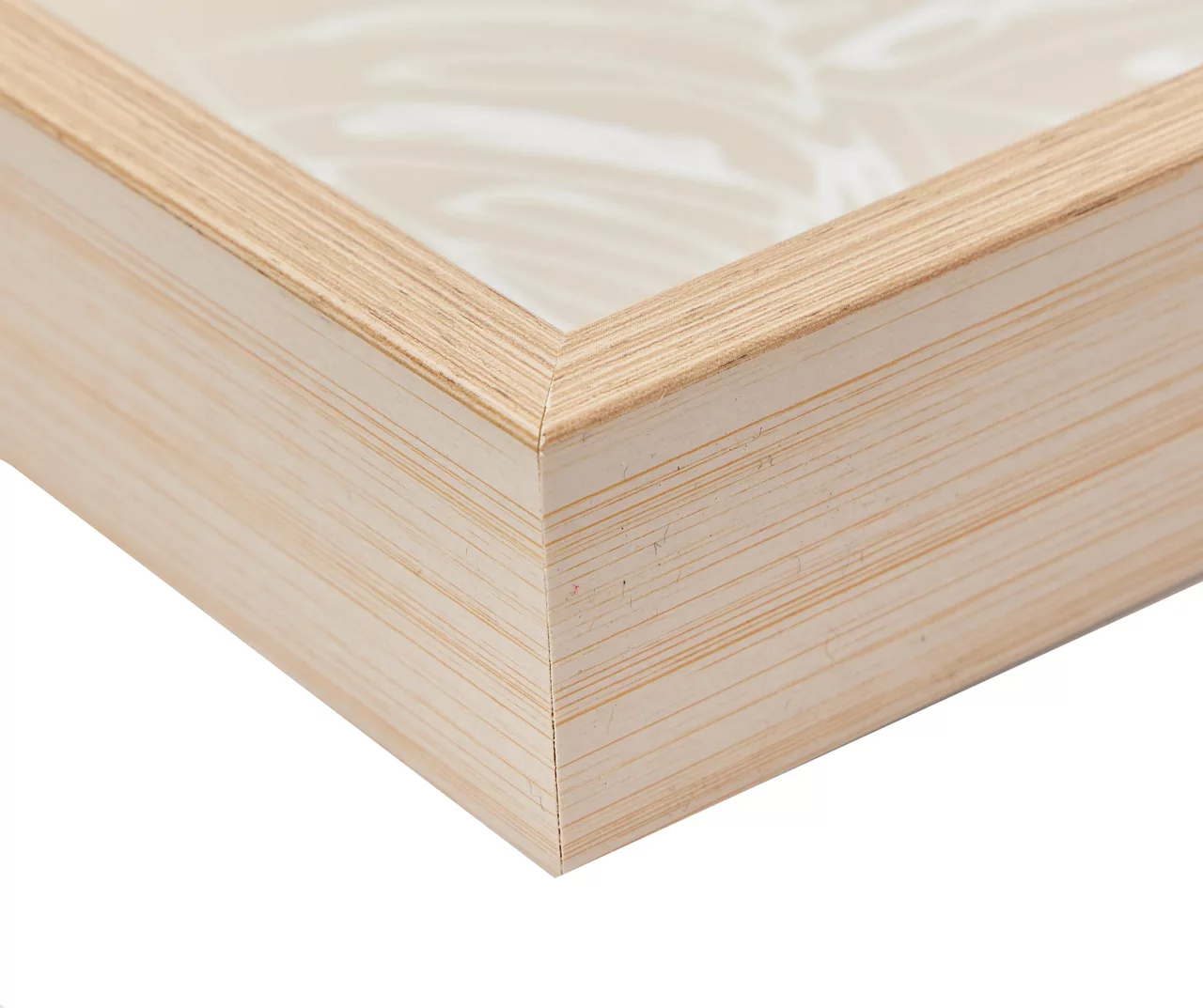 Add big cat beauty to your home decorating with this framed print. A tiger is illustrated in watercolor-like brown on sepia paper and shown behind glass accented with white palm leaves, creating a dimensional effect. Presented in a woodgrain-look frame with a beveled inner design, this print is a stunning and exotic addition to a living space.