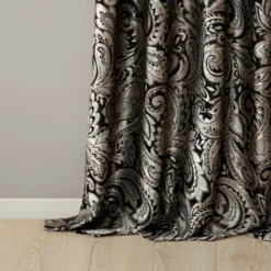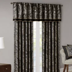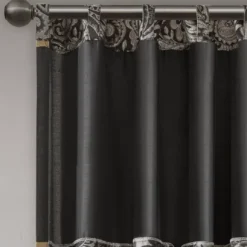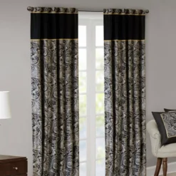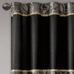 For a luxuriously classic style, the Valerie curtain panel pair is the perfect touch to your decor. The alluring jacquard weave is inspired from an updated paisley motif and is woven in beautiful hues of black, gold and a hint of platinum for a shimmering accent. The window panels are pieced with solid faux silk and beautiful flat piping details in gold, creating an elegant look. Simply hang on rod pocket or back tabs for a tailored finish.