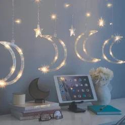 Create a whimsical and warm living space with the addition of these celestial battery-powered LED curtain lights featuring large moon and small star shapes on flexible, clear wires.