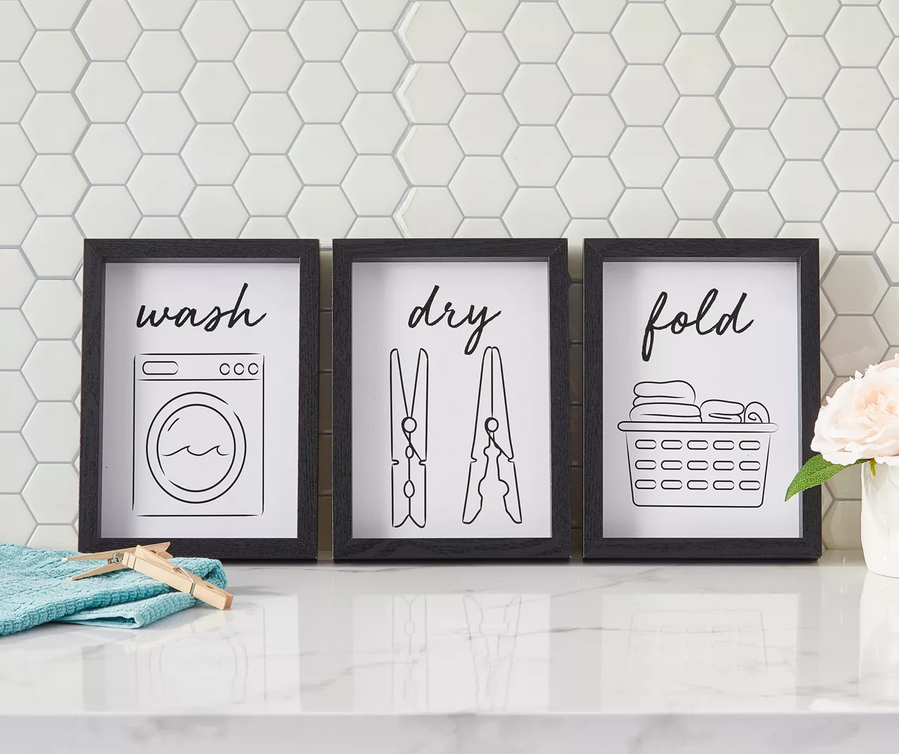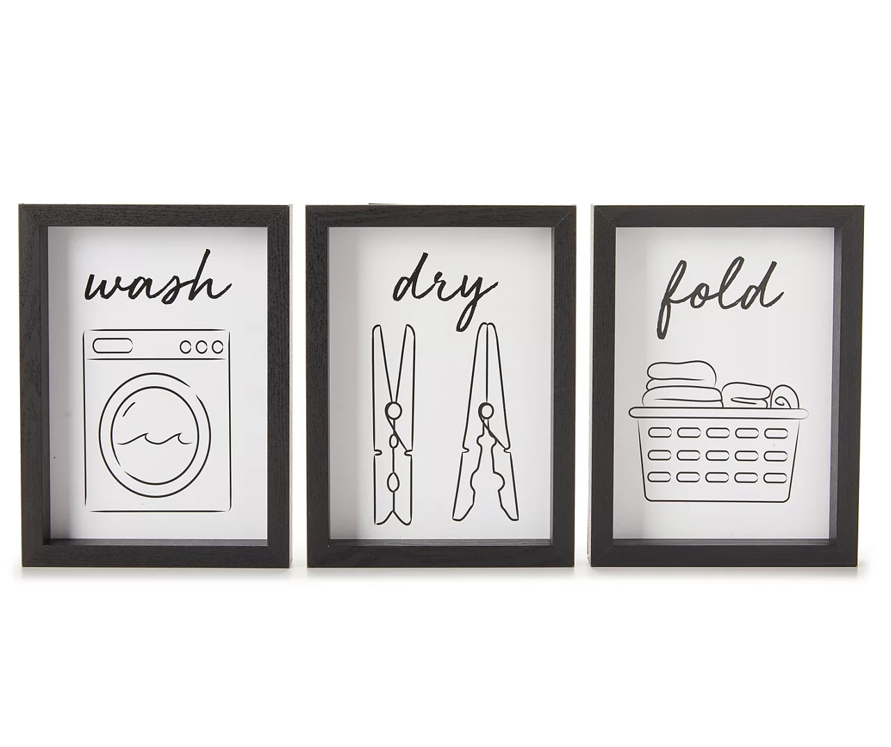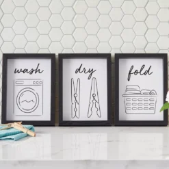 Liven up the laundry room with a touch of elegance when you add this trio of framed wall art to your space. “Wash, dry, fold” messaging and a minimalist aesthetic works together for modern simplicity.