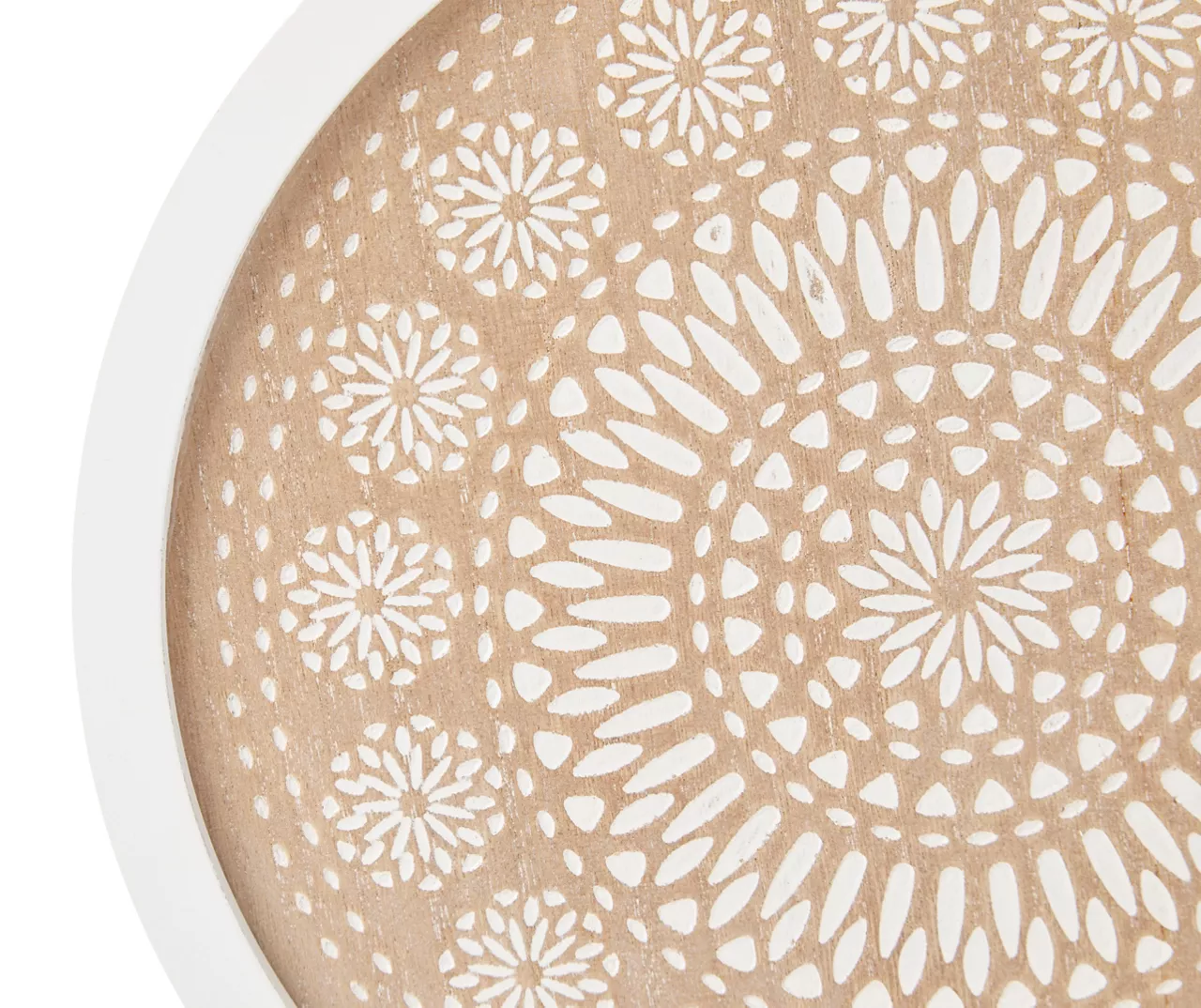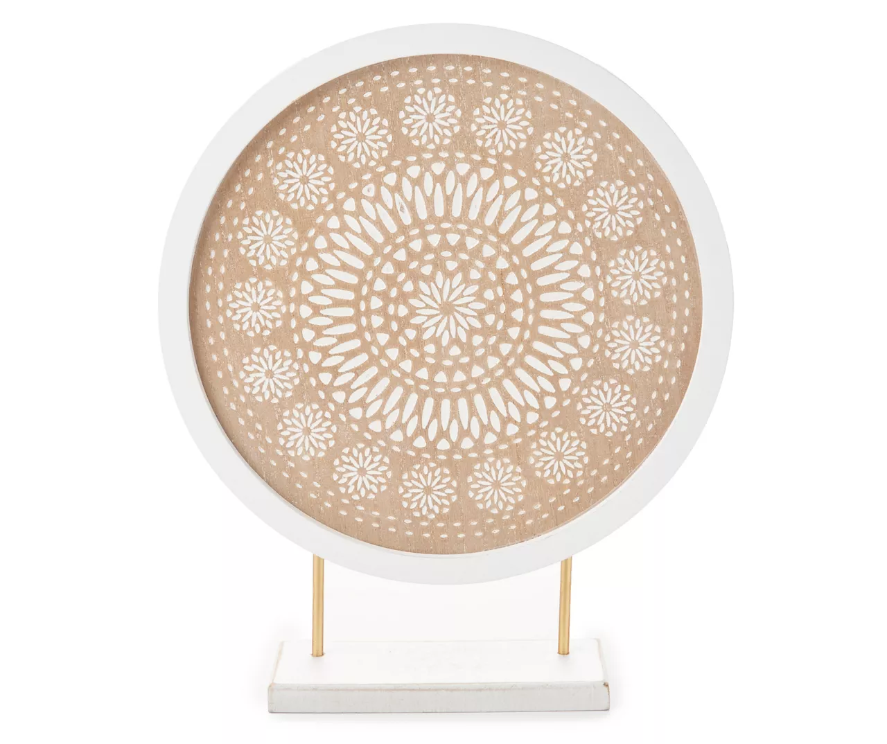 Add a touch of boho elegance to your living space with this lovely tabletop plaque. A simple wood base and two golden rods support a vertical wooden medallion design in white on brown fabric-like material for rustic flair.
