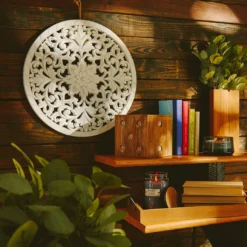 With a rounded shape, carved baroque detailing and weathered white finish, this medallion plaque brings rustic elegance to your walls, and can be easily hung thanks to a jute rope at the top.