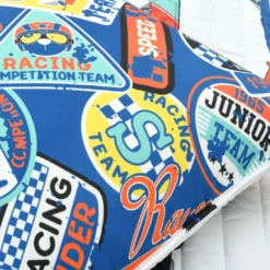 - Quilt front features a race car motif and reverse side features a racing/traffic sign design