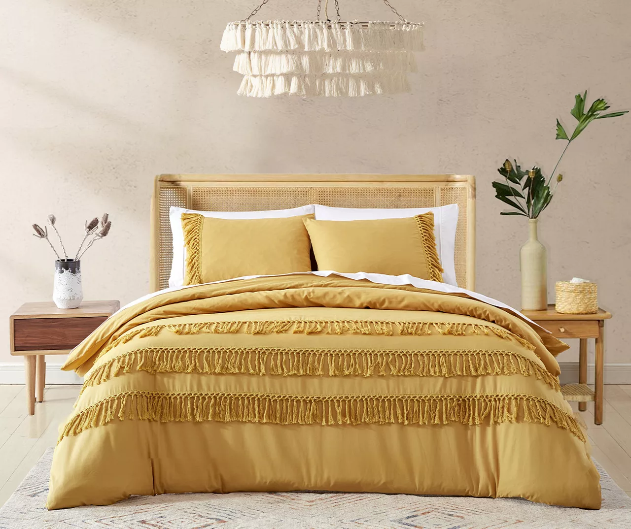 Rows of macrame tassels bring playful movement and boho flair to this cozy and soft comforter set in a bright marigold yellow color. It’s a modern way to brighten any guest or master bedroom, and the breathable cotton keeps you comfy through the night.