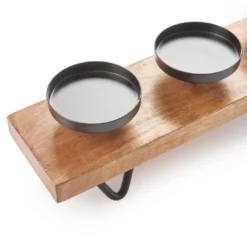 Freshen your space with some modern industrial style when you add this candle holder to a centerpiece, tabletop, mantel or shelf. It features elevated metal platforms that can hold up to five pillar candles, and the wood base is supported by angled metal legs for stability.