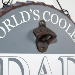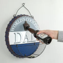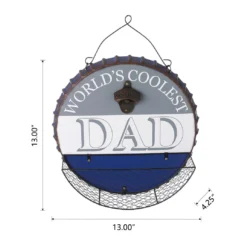 Celebrate dad with this crafted bottle cap sign. “World’s coolest dad” is written on a gray, white and blue color background. A chicken wire basket displays below the bottle opener for catching caps from brews and soda.